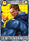 Demitri Maximoff is a vampire who first appeared in Darkstalkers: The Night Warriors and is the main character of the series. His game play strikes many similiarities to Ryu and Ken from the Street Fighter series. Demitri was also a playable character in the Capcom cross over, SNK vs. Capcom: SVC Chaos and in Capcom's very own Capcom Fighting Evolution.